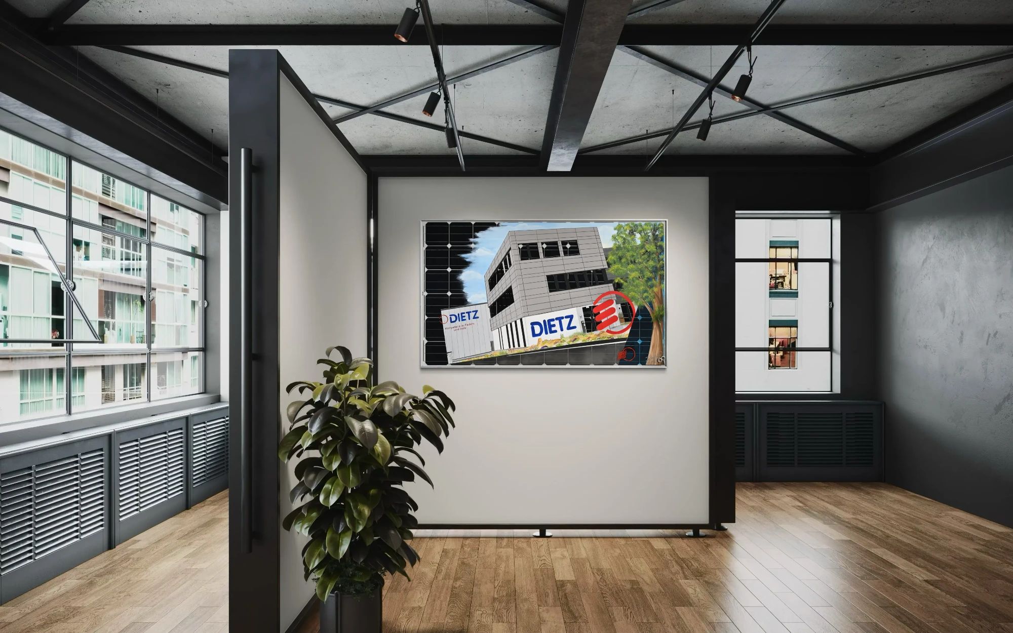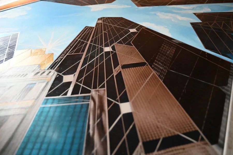 "Die Stadt" in einem Hochhaus aufgehängt